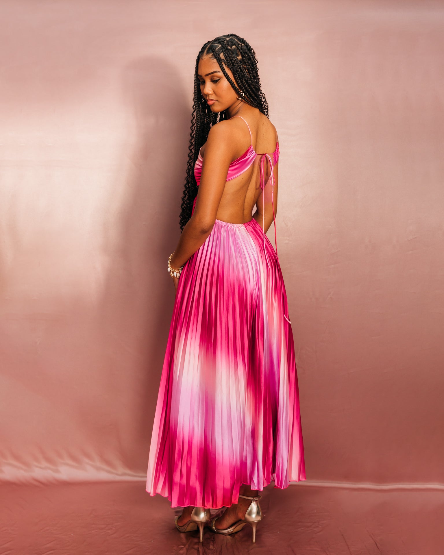 Une ode à la féminité et à la liberté. La Rosa del Sol sublime chaque mouvement avec son plissé délicat et son dégradé lumineux de rose. Son bandeau qui se noue dans le dos dévoile un dos nu sensuel, parfait pour un été romantique et élégant.