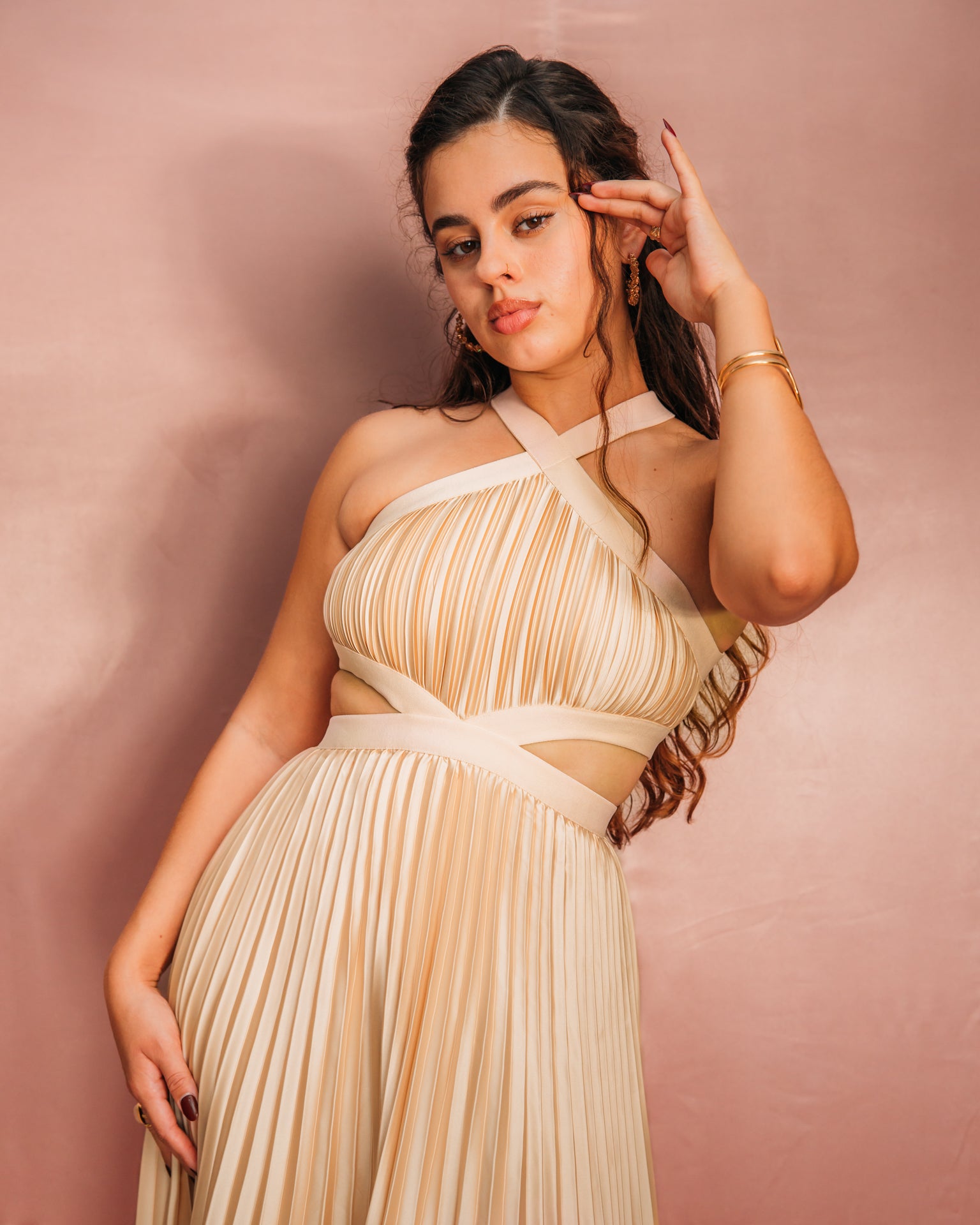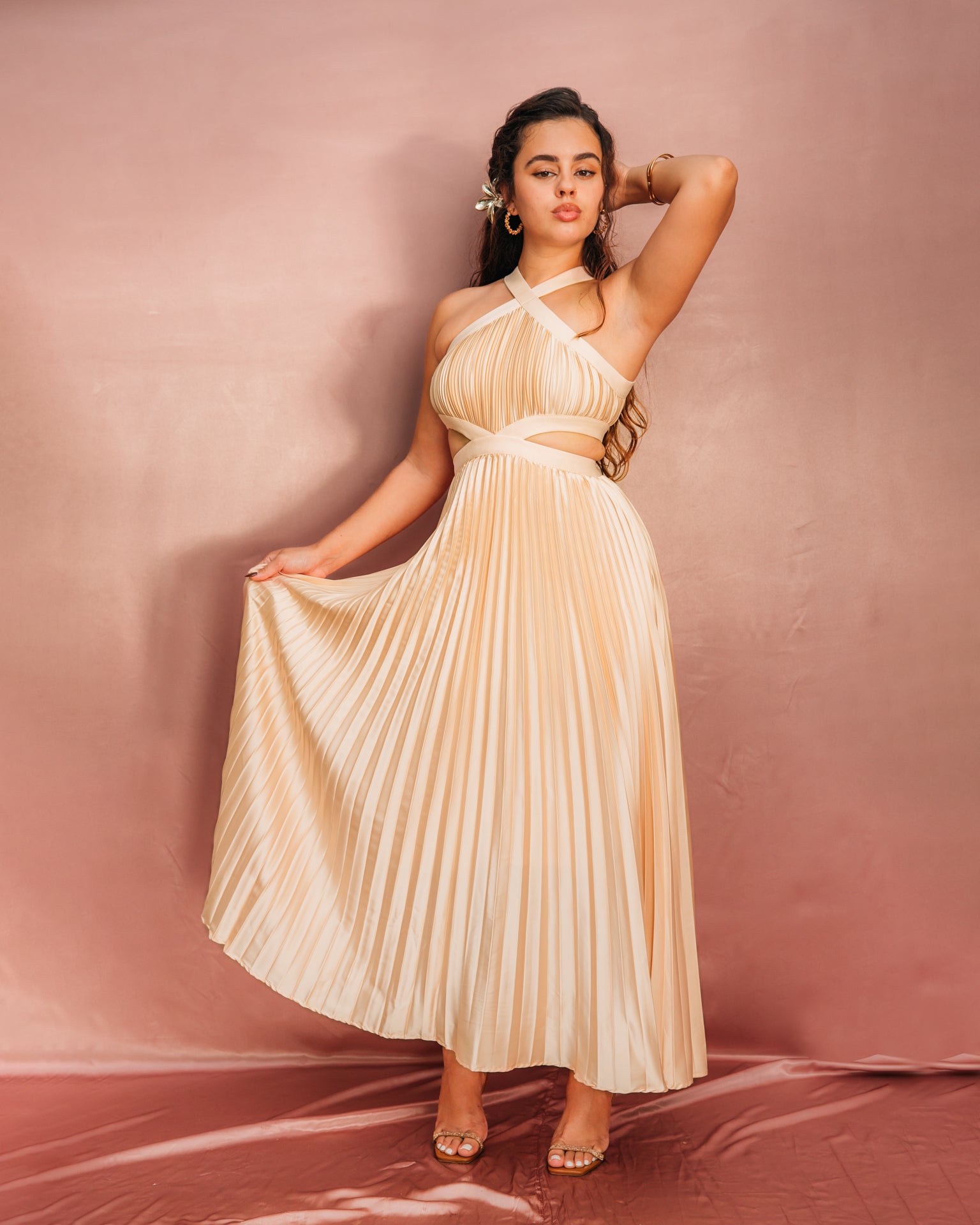 Délicate et raffinée, la Rosa Suave allie l’élégance du satin poudré à la modernité des découpes. Son plissé subtil reflète la lumière avec douceur, créant une silhouette fluide et gracieuse. Une robe pensée pour sublimer la féminité avec sophistication.